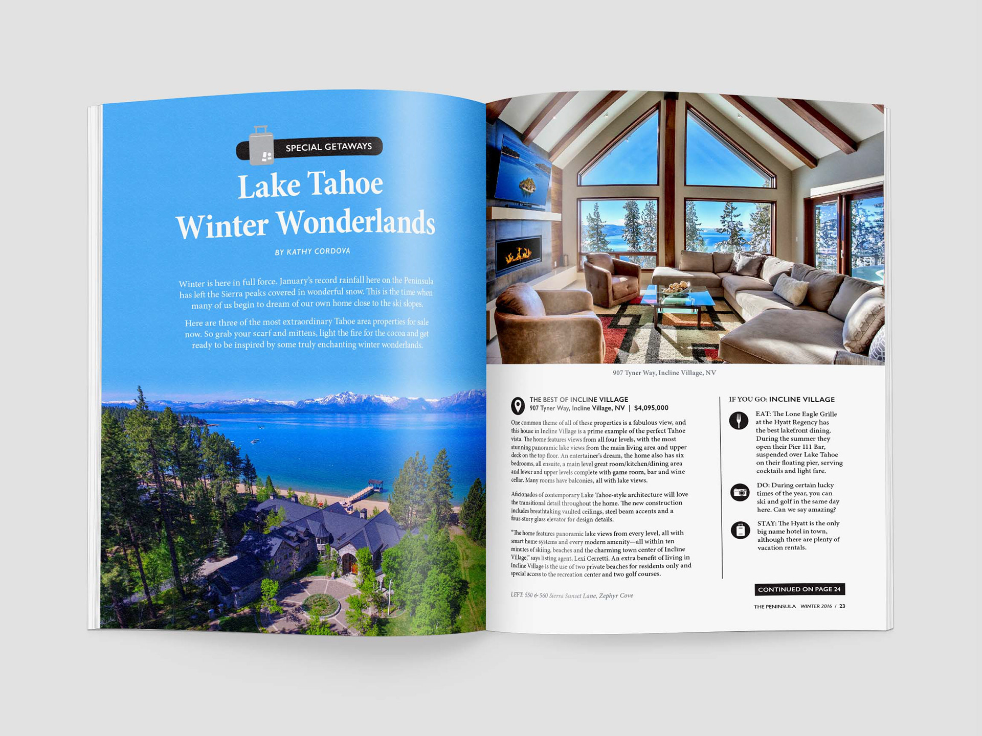 Properties of Note — This is the main cover story that features a unique listing, usually one of our agent's listings. Occasionally we will feature one outside of our brokerage, such as this one in Lake Tahoe.
