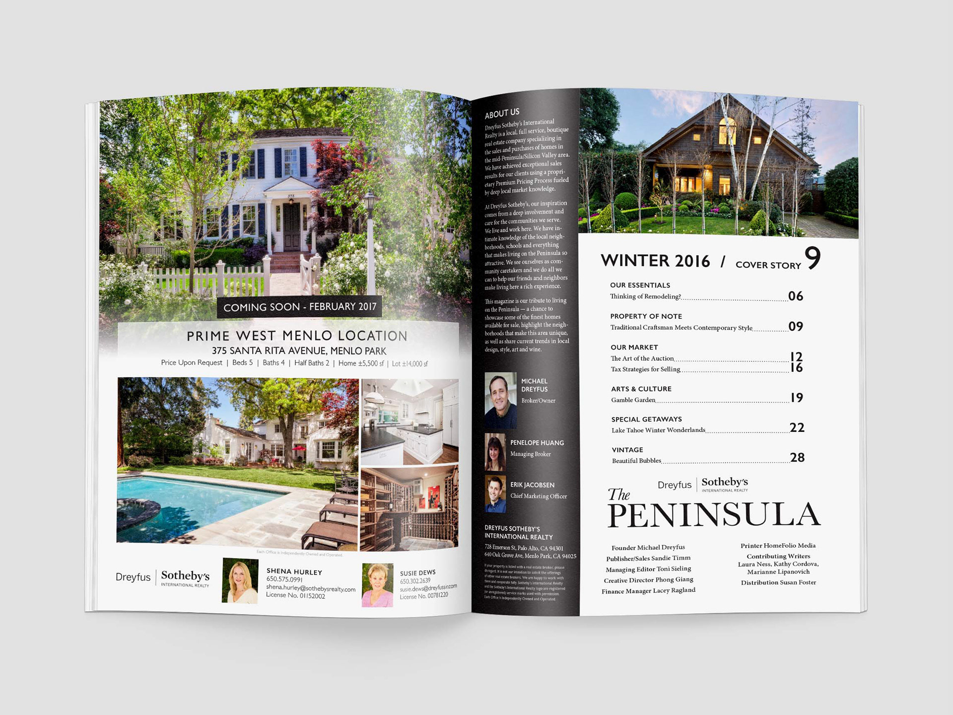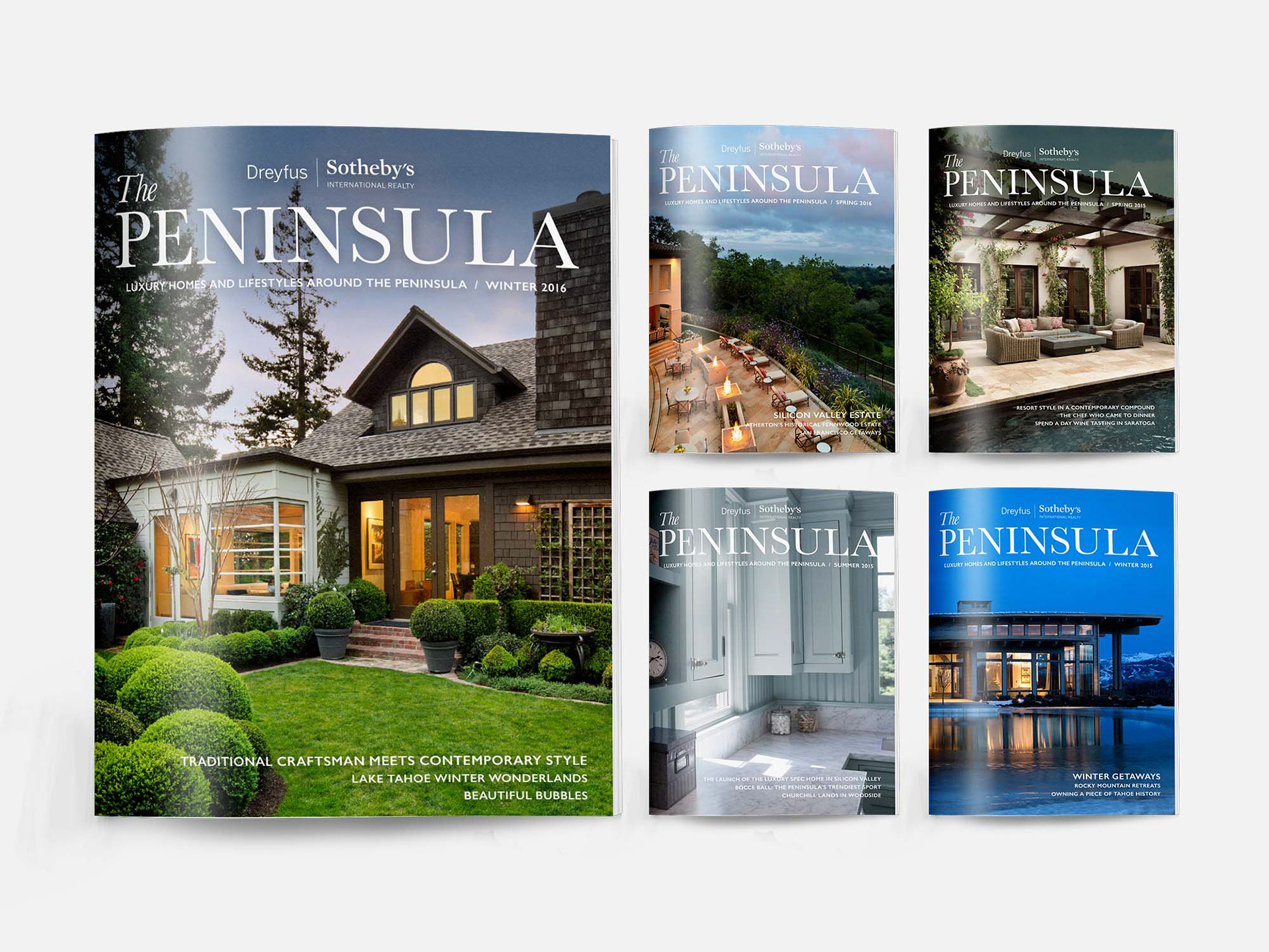 I was the designer of The Peninsula magazine, a local in-house magazine for a luxury real estate brokerage. The goal of the magazine was to give our agents another avenue to promote their business through ads and advertorials as well as spreading word of our brokerage. It was released quarterly for 2 years and distributed to households in the Mid-Peninsula.