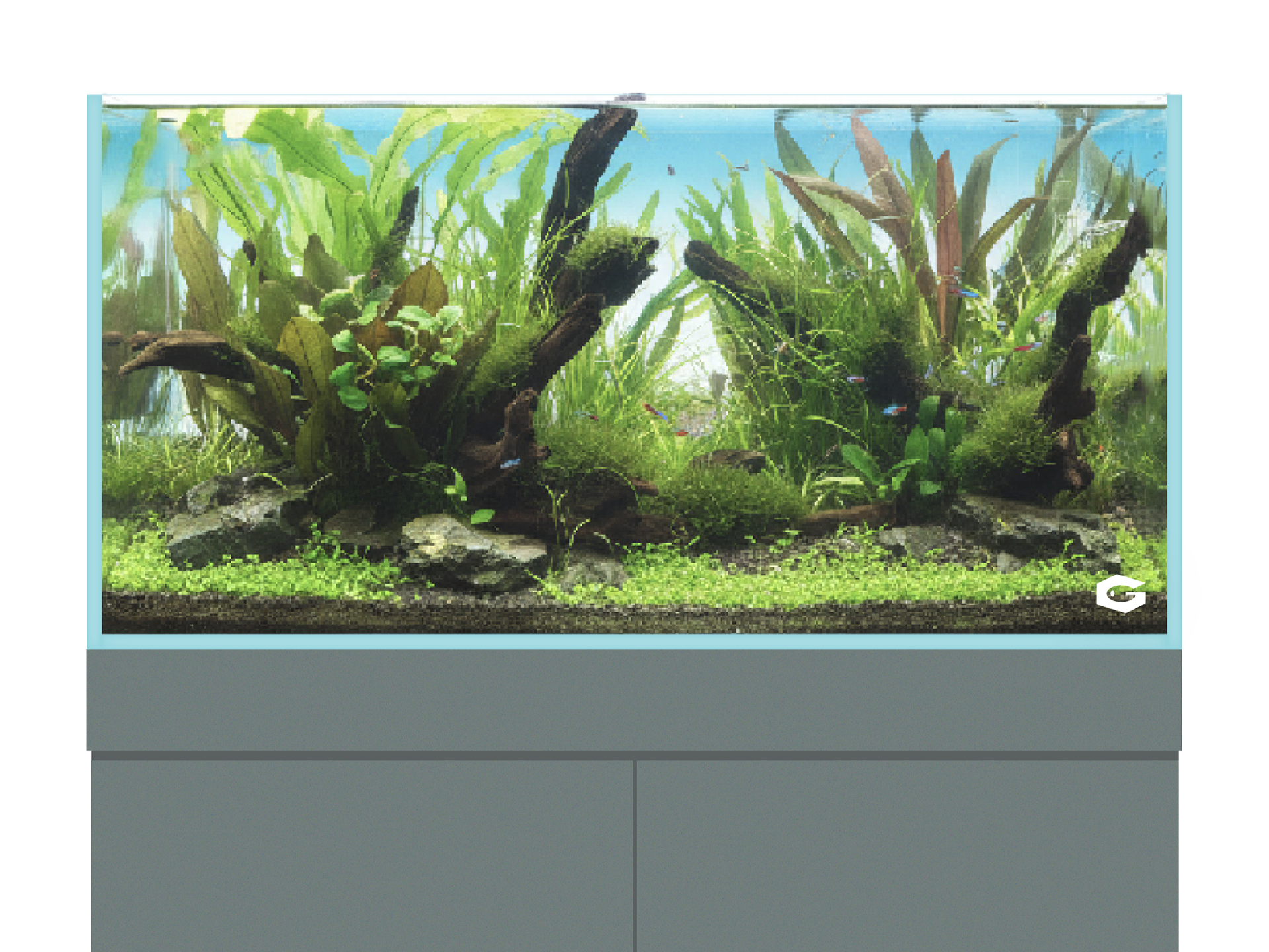 The tank and cabinet were created in Illustrator while the aquascape was generated by AI. The logo is etched onto the glass and contrasts with the substrate layer.