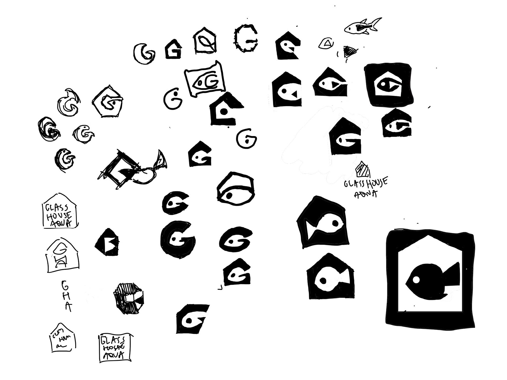 Vector iterations — The evolution of the home/G motif from a house to an aquarium viewed from a top corner angle. The fish was inspired by the espei rasbora, with its characteristic black line running down its body.