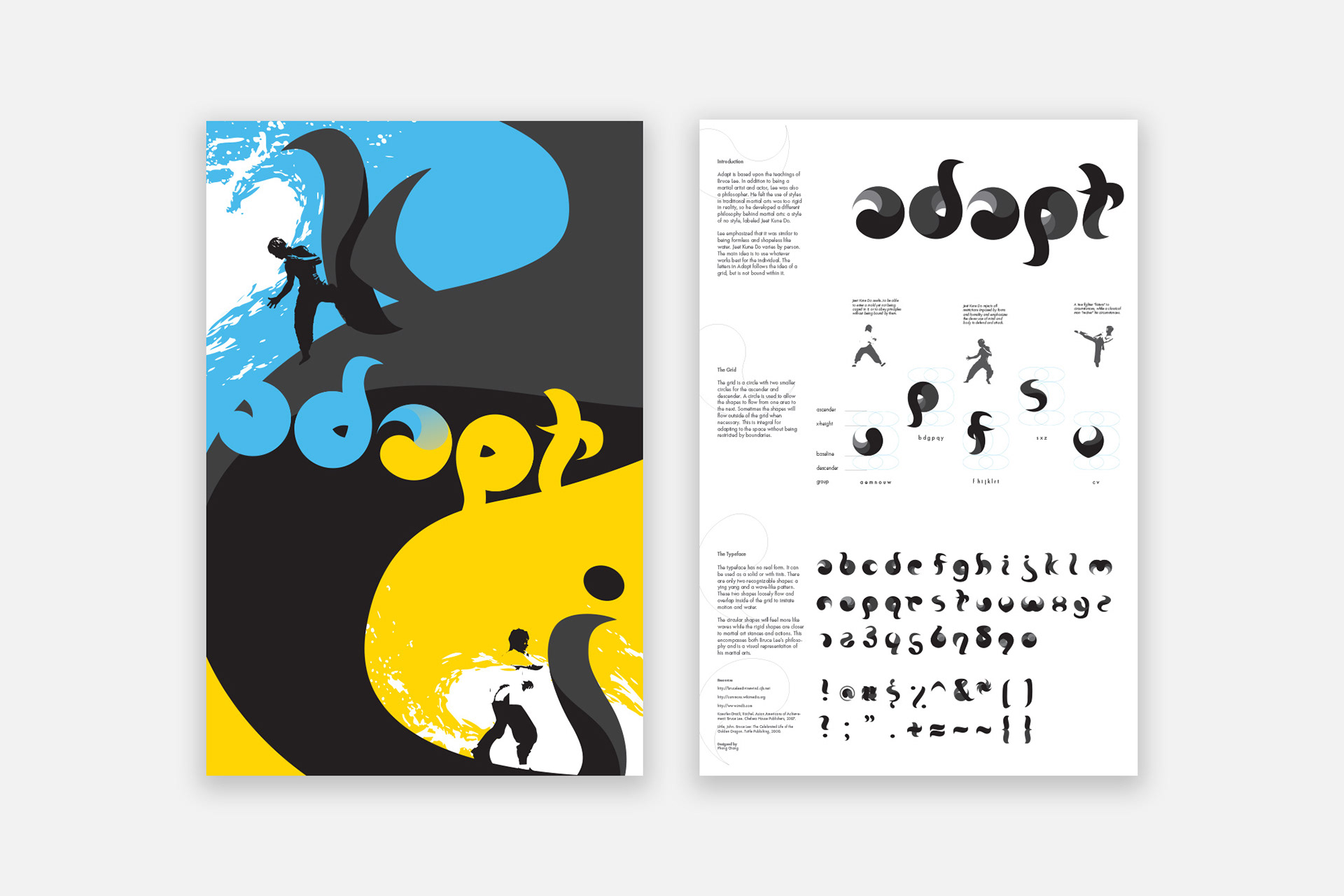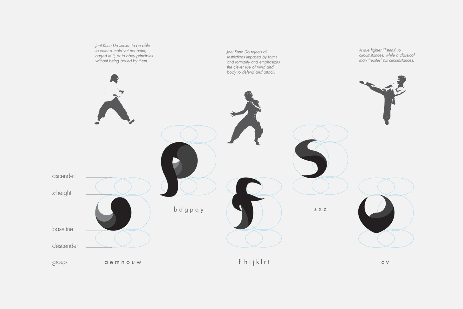 The grid takes the form of a container where the type can flow and adapt freely. Circular letters have fluid characteristics while those with "limbs" such as j,k, and t resemble Bruce Lee in various action stances.
